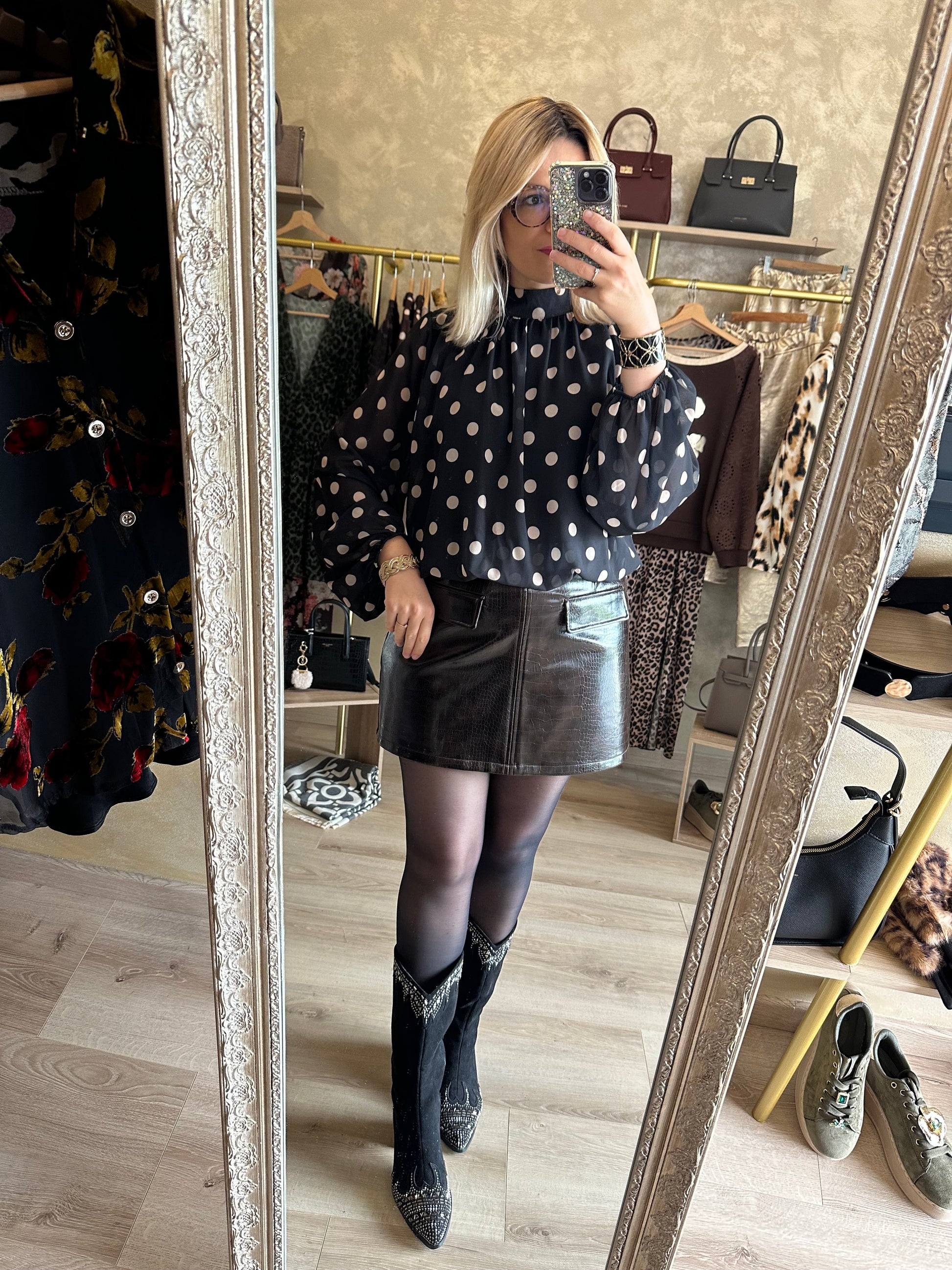 - Blouse coup de cœur noire à pois, chic et ultra stylée pour l’automne