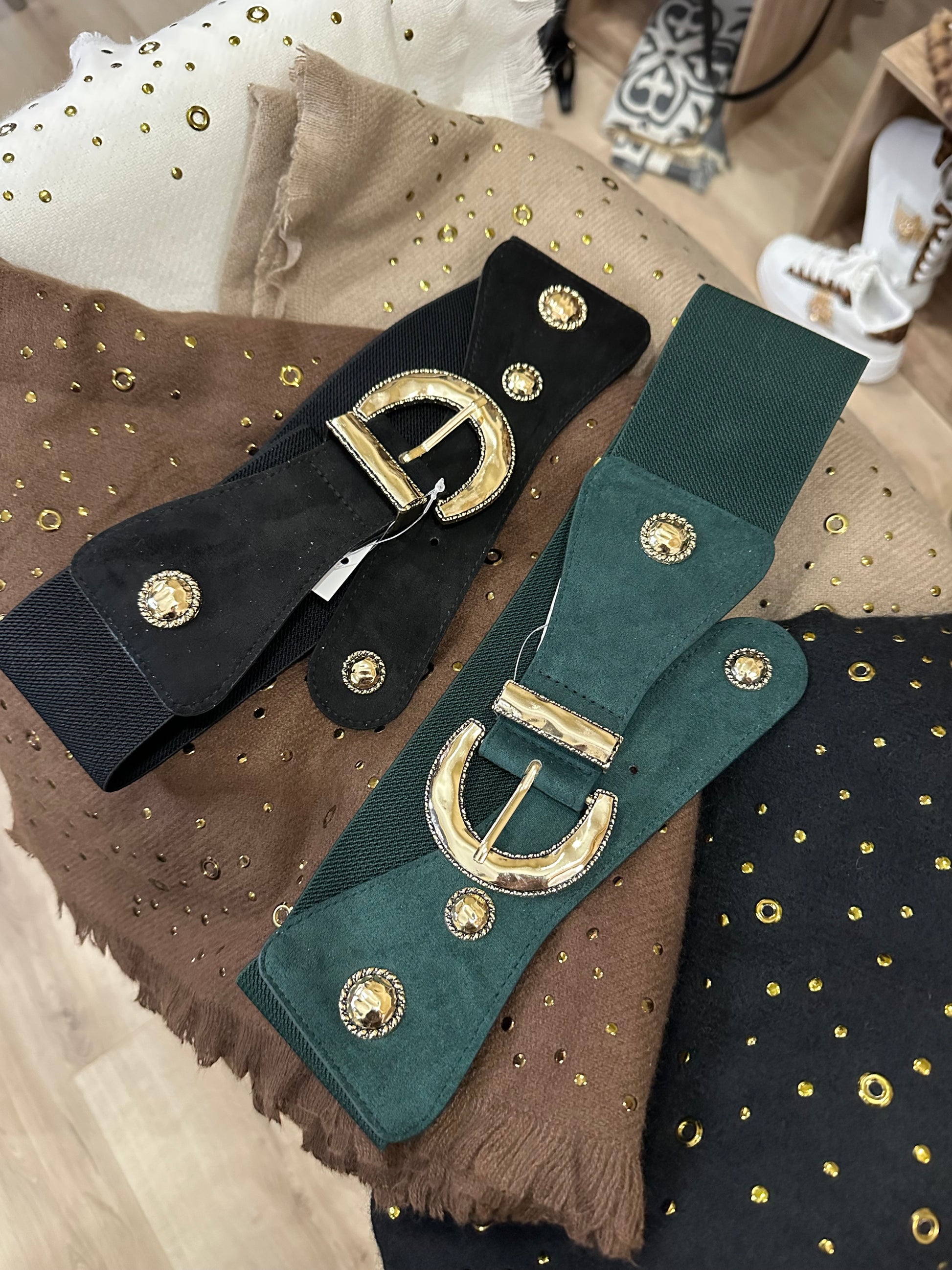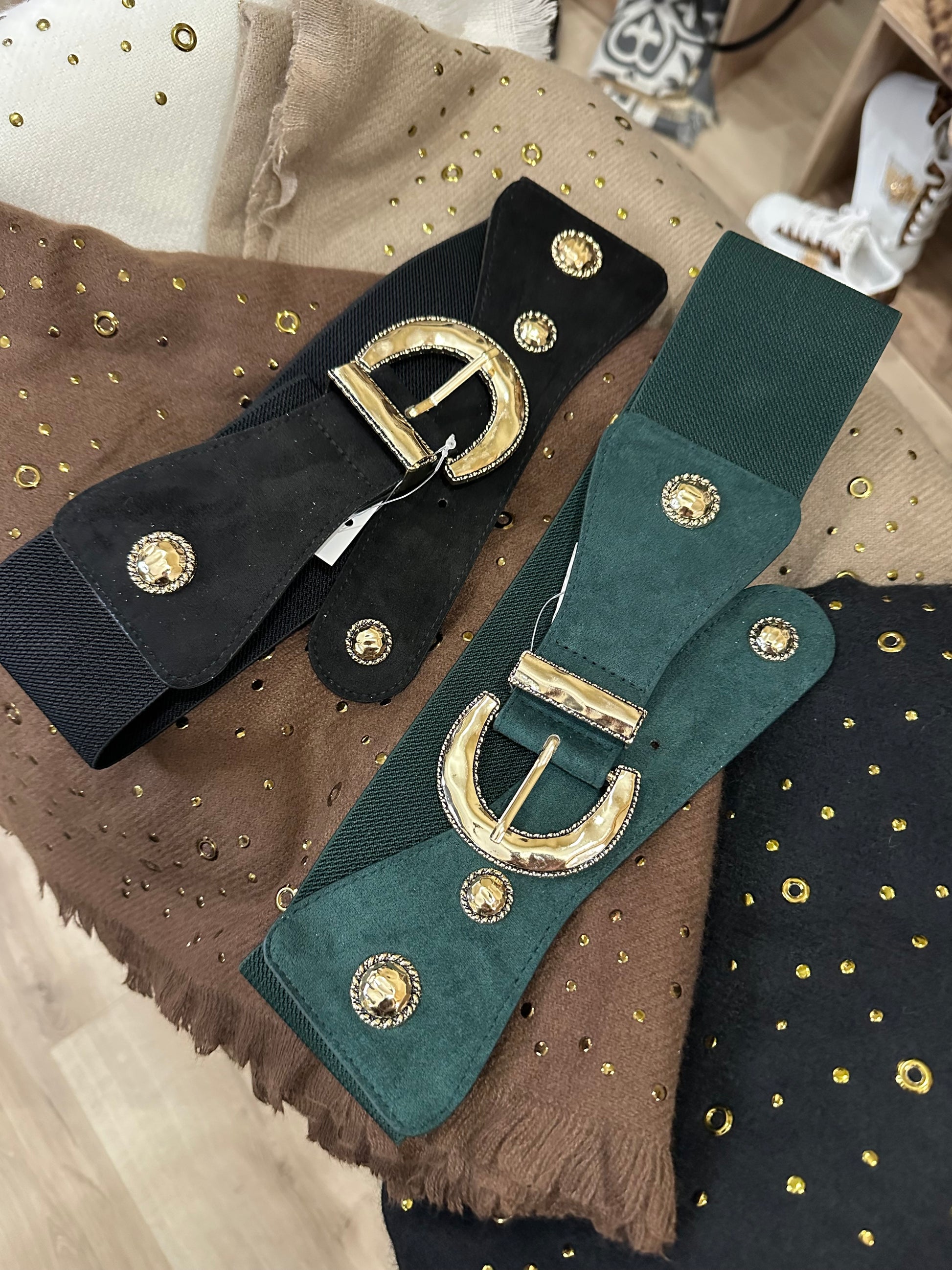 Ceintures fantaisies effet daim très chic. Ceintures qualitatives. Boucle en métal doré effet frappé.