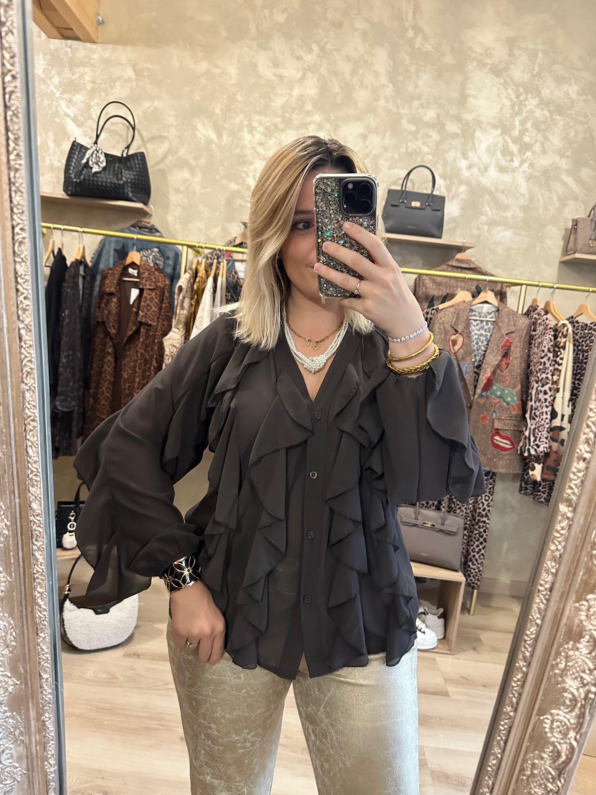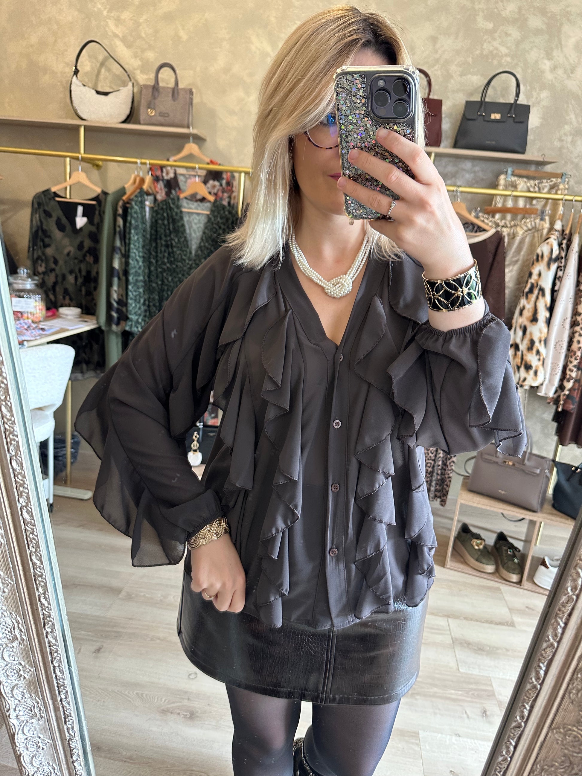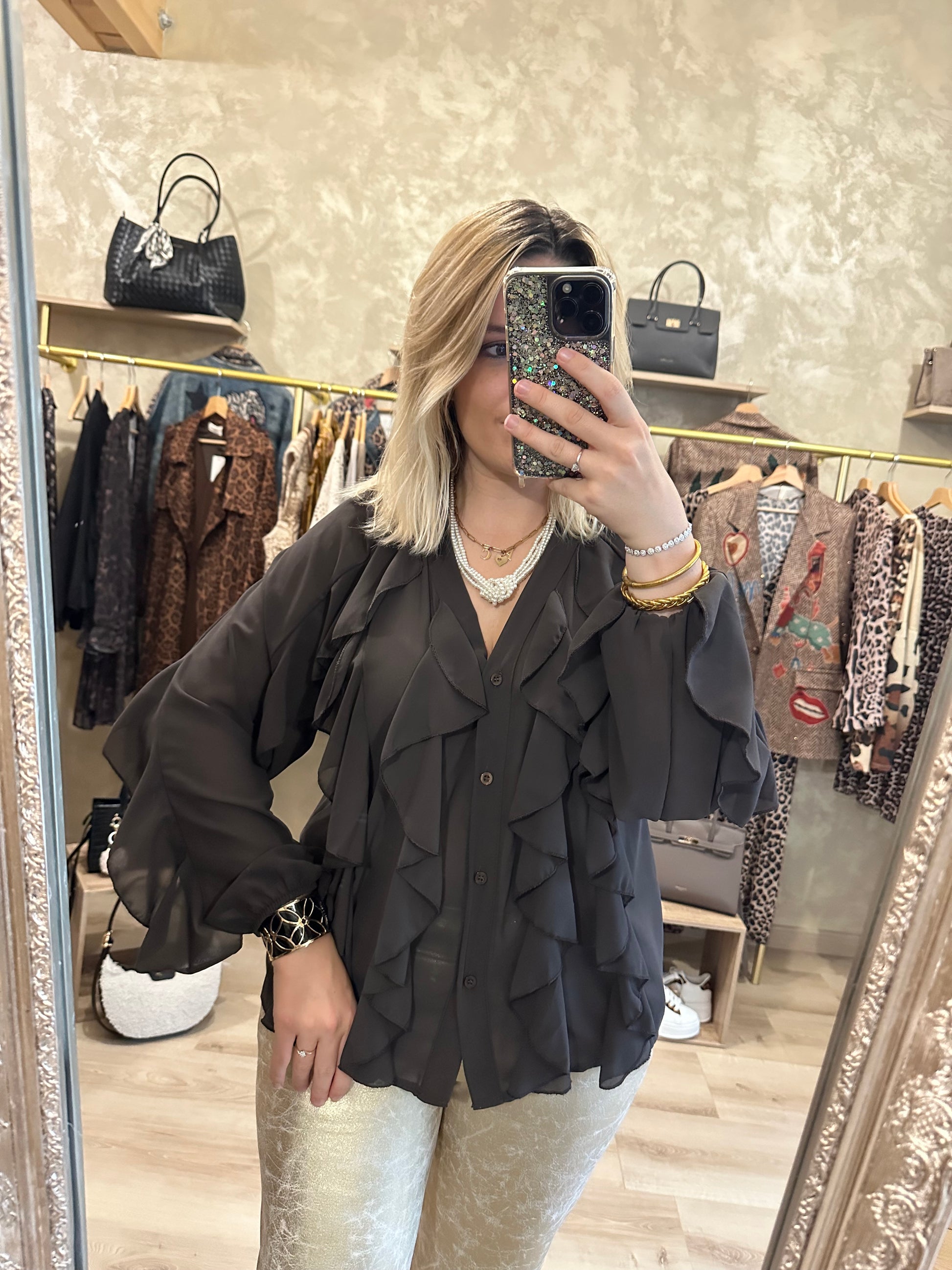 - Chemisier couleur chocolat chic en voile manches longues avec des volants sur le devant et aux manches