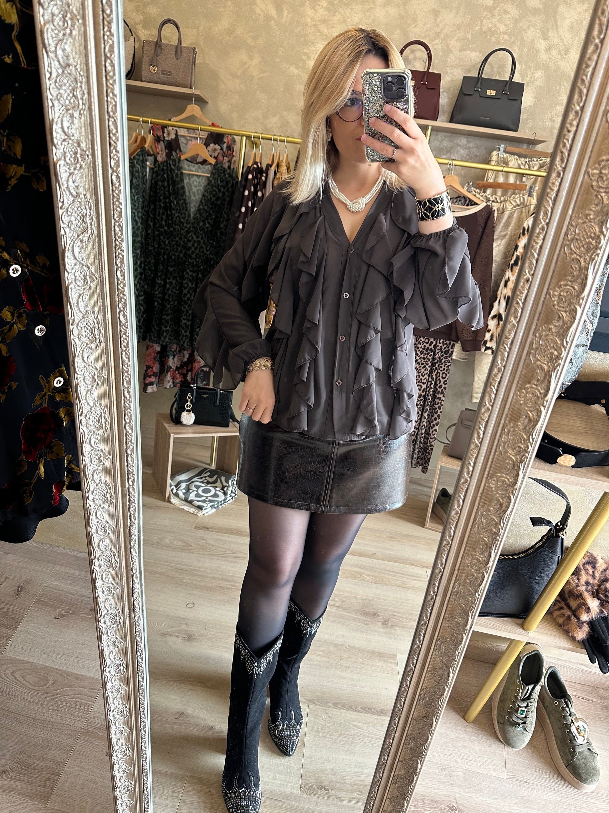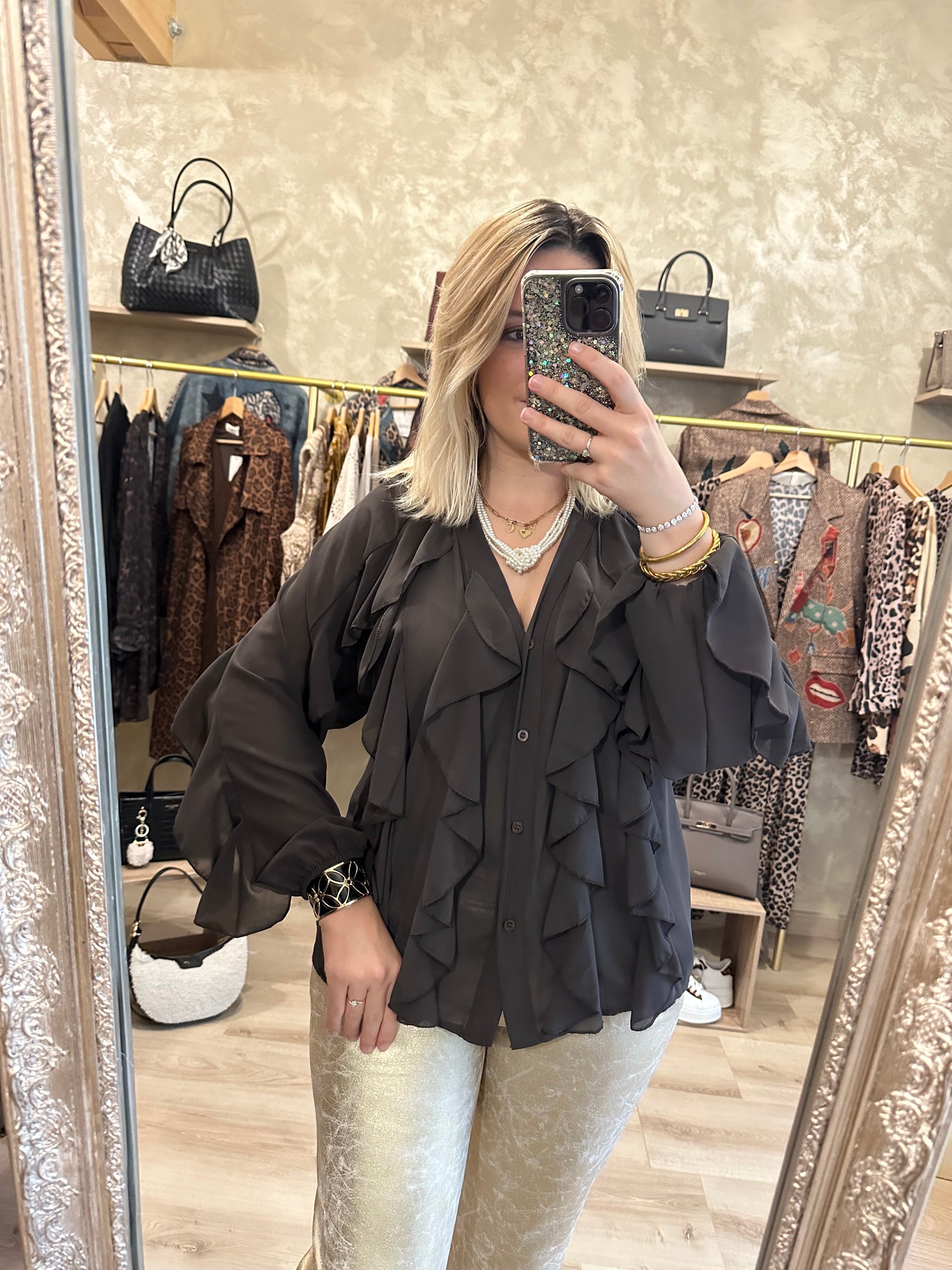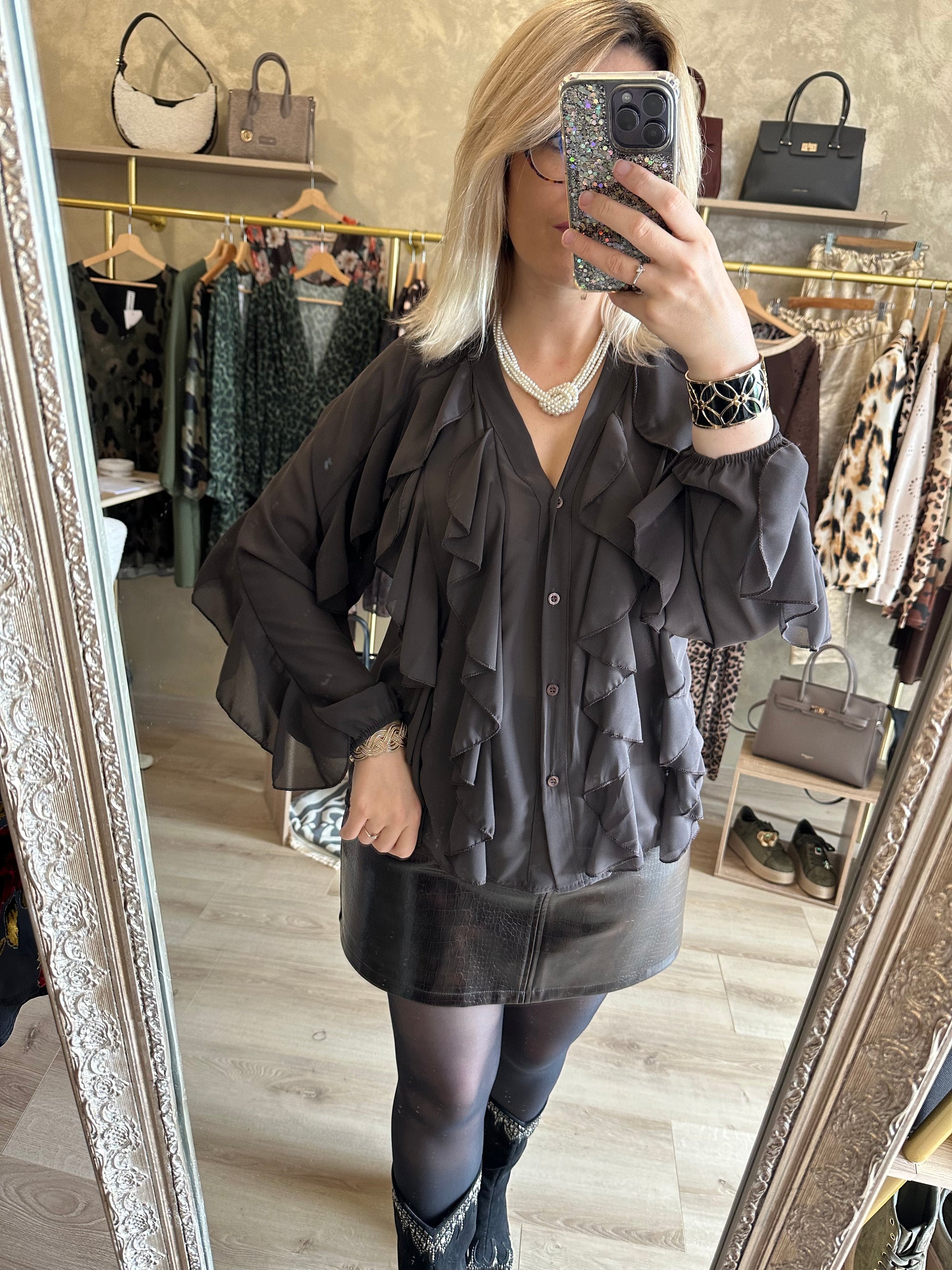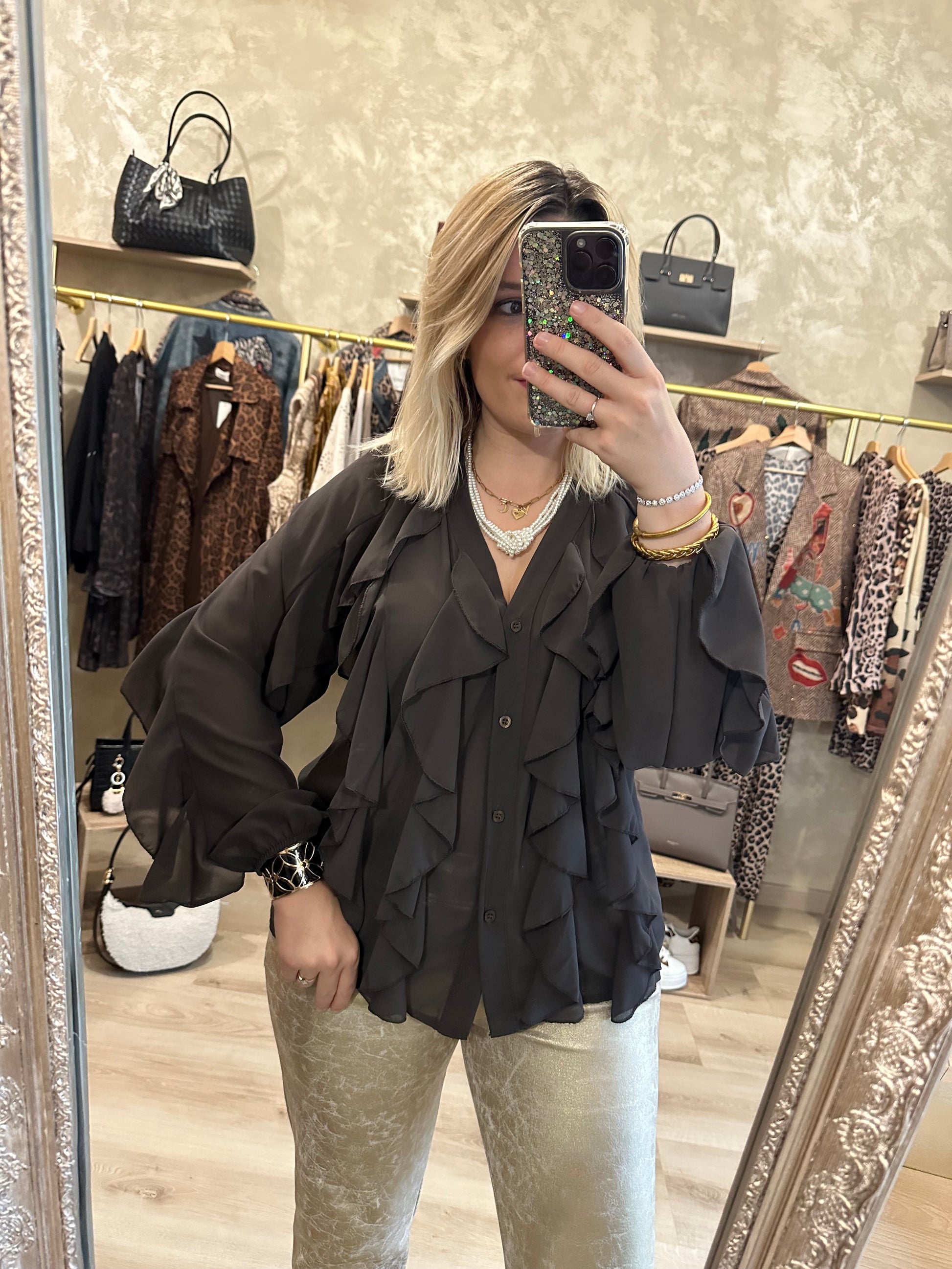 - Chemisier couleur chocolat chic en voile manches longues avec des volants sur le devant et aux manches