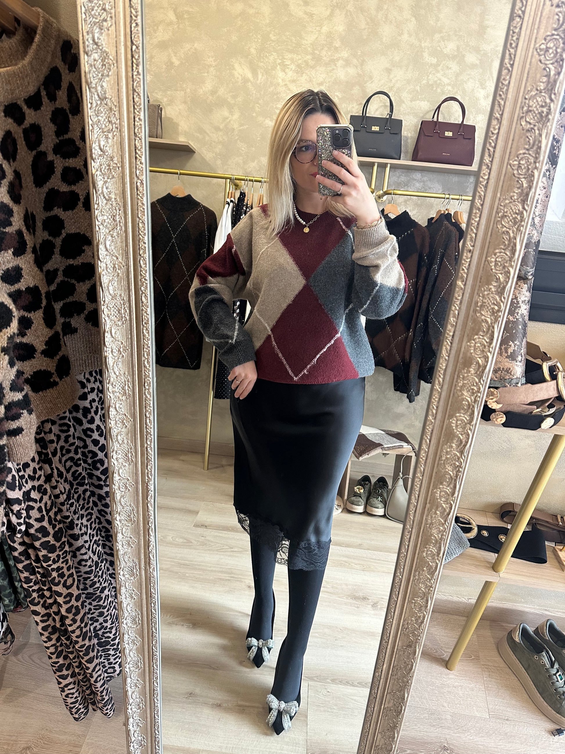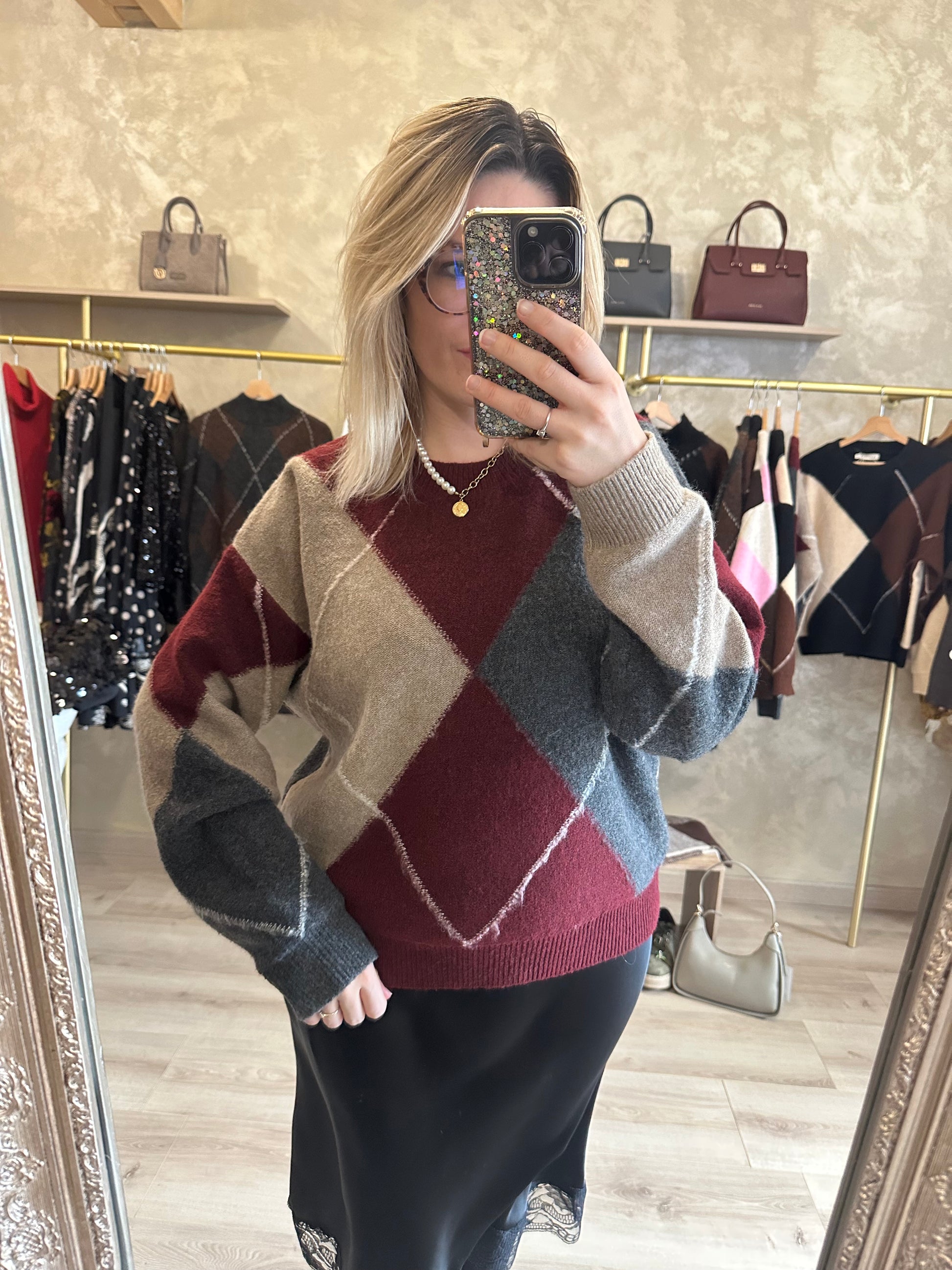 - Le pull tendance de la saison avec son imprimé jacquard bordeaux gris et beige arrive en boutique !