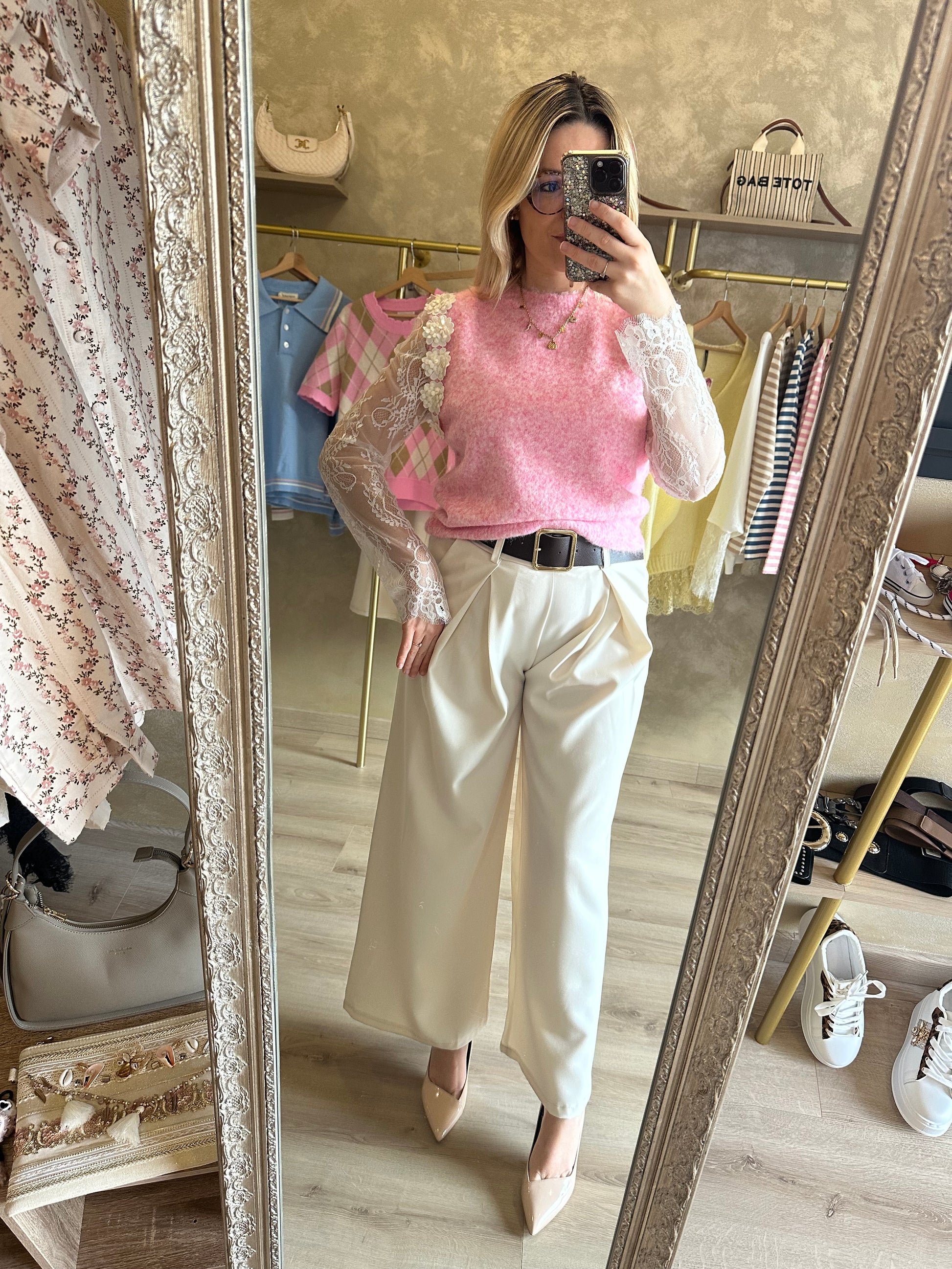 - Pull sans manches chic et élégant rose avec fleurs blanches sur le bord des manches