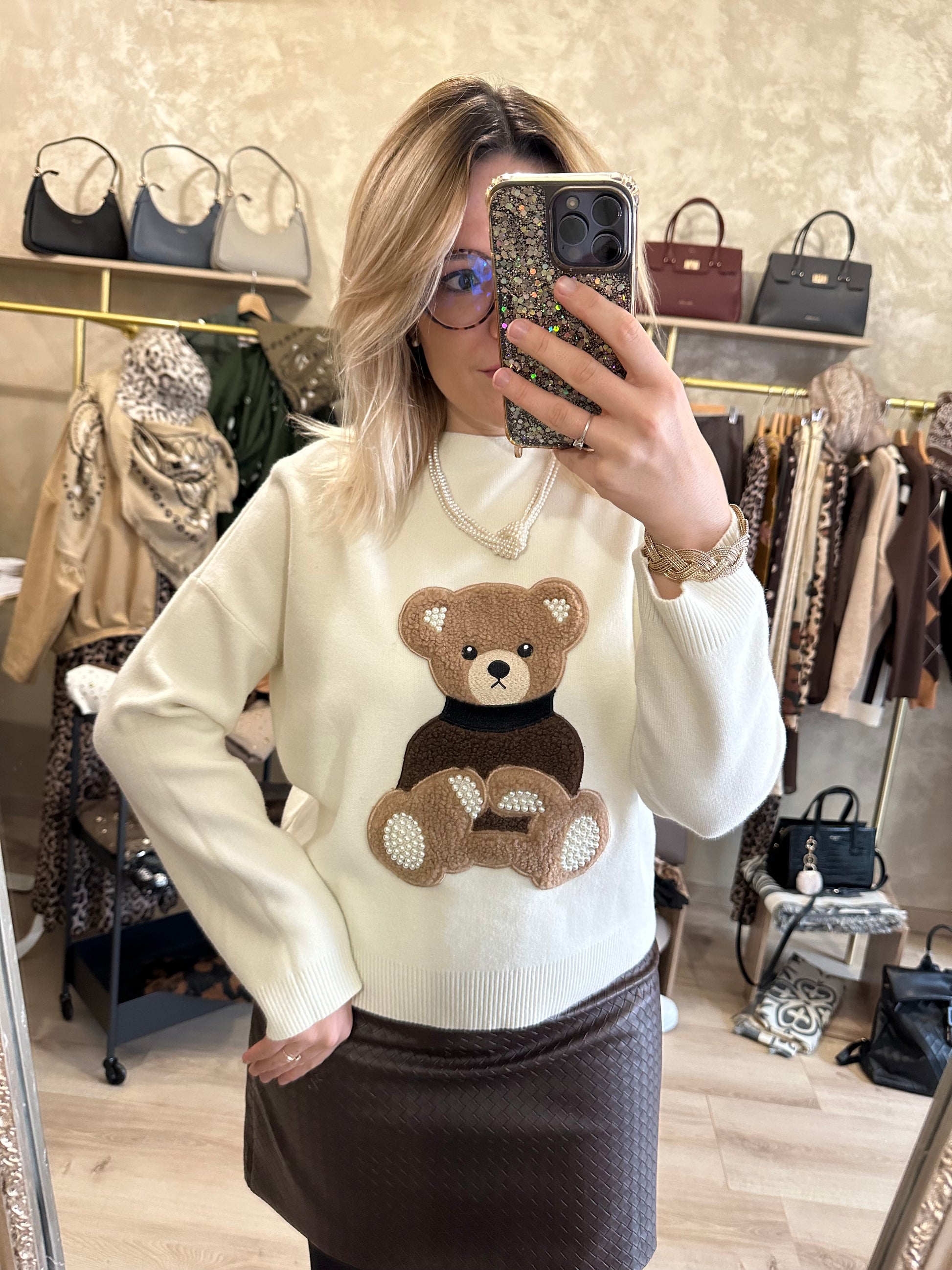 - Pull crème avec gros ours en peluche brodé en imitation moumoute et avec des perles nacrées blanches pour un effet chic