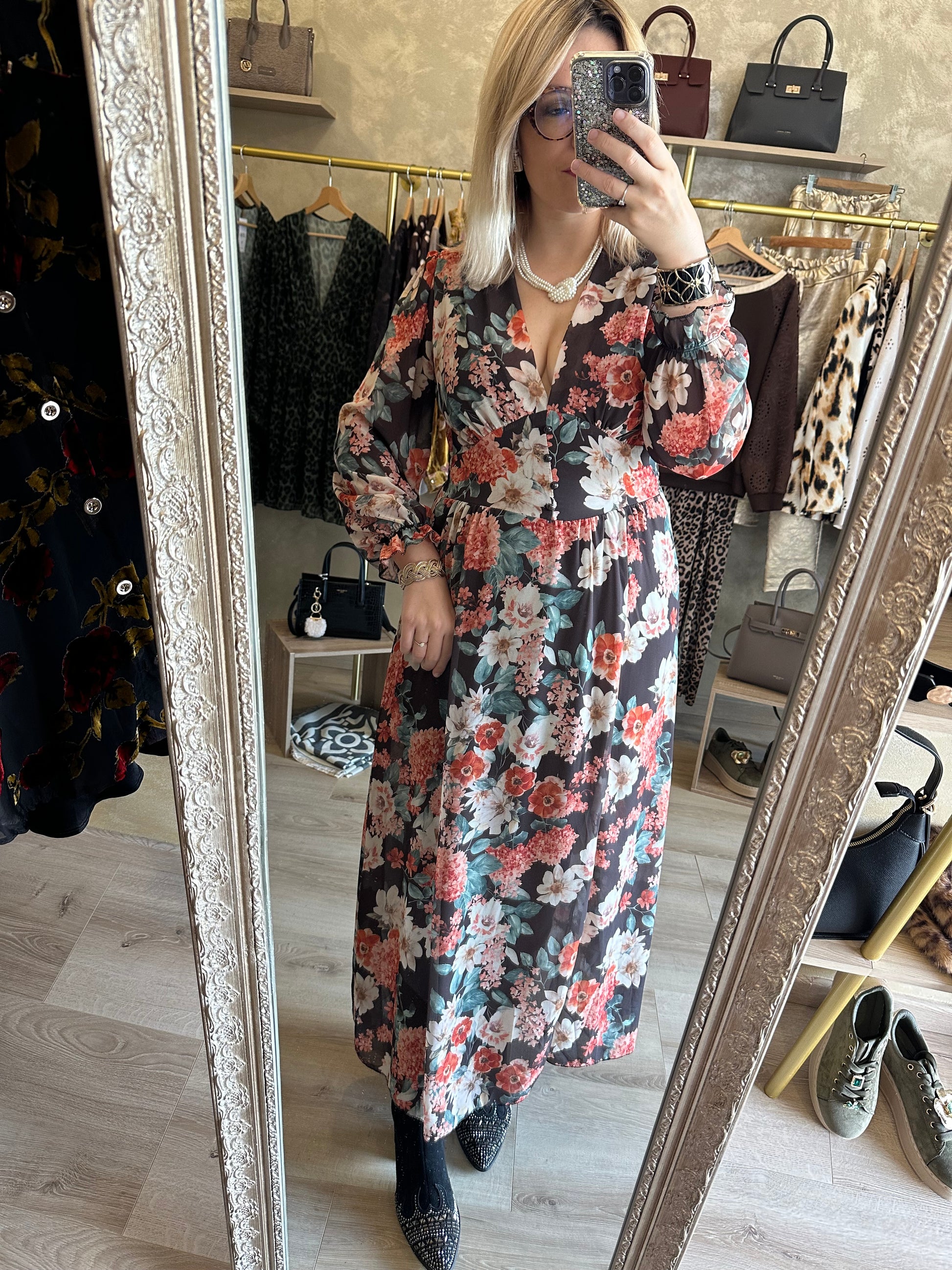- Élégante robe longue au motif floral automnal, décolletée, légère et doublée pour plus de confort
