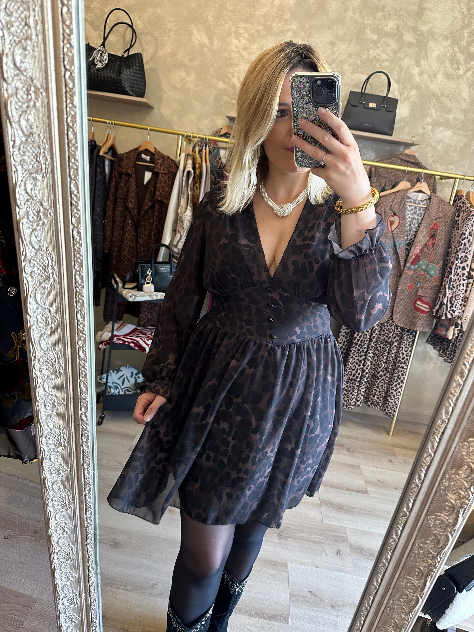 - Robe décolletée léopard marron foncé, fluide et aérienne avec doublure
