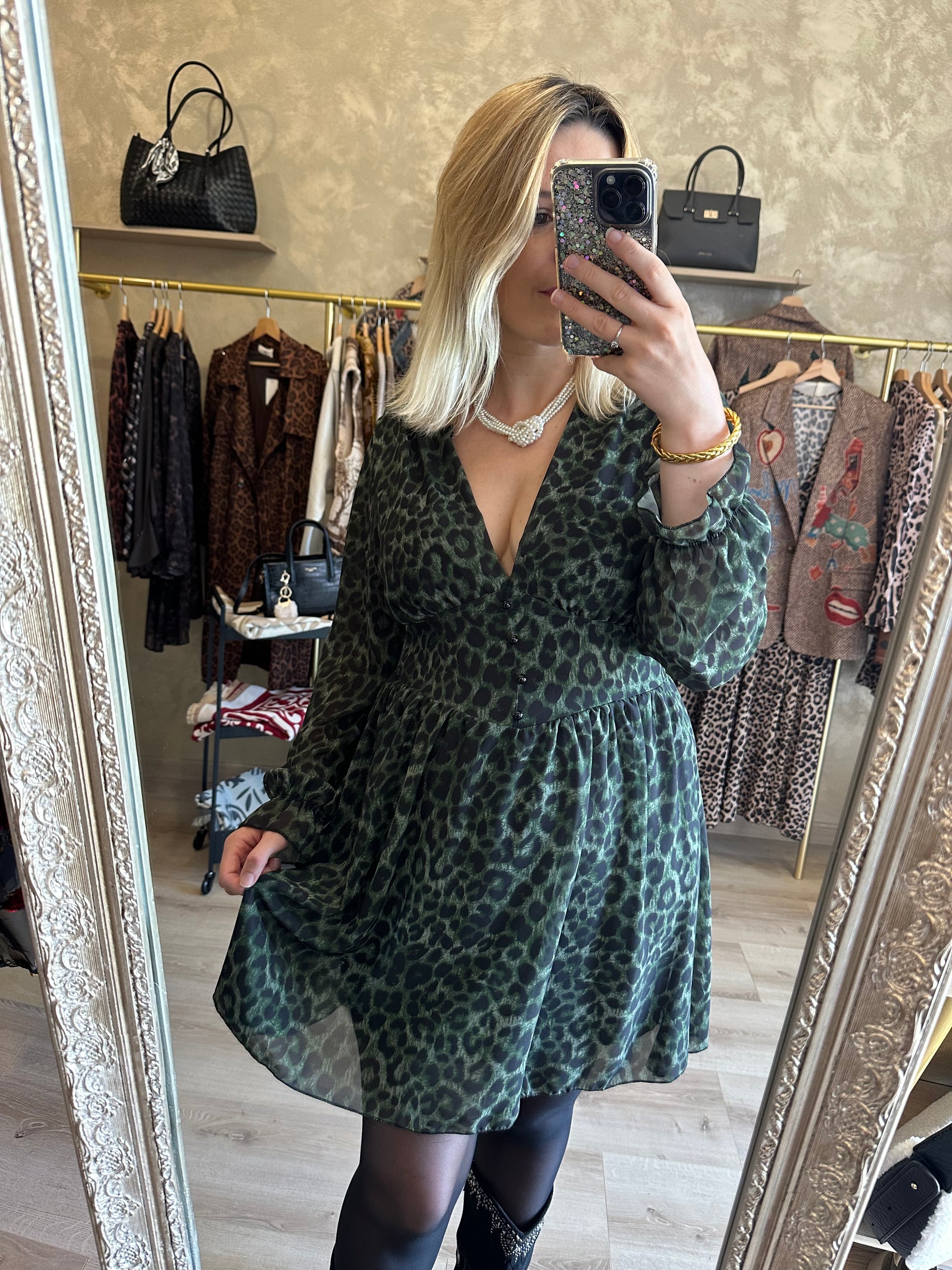 - Robe décolletée léopard kaki, fluide et aérienne avec doublure