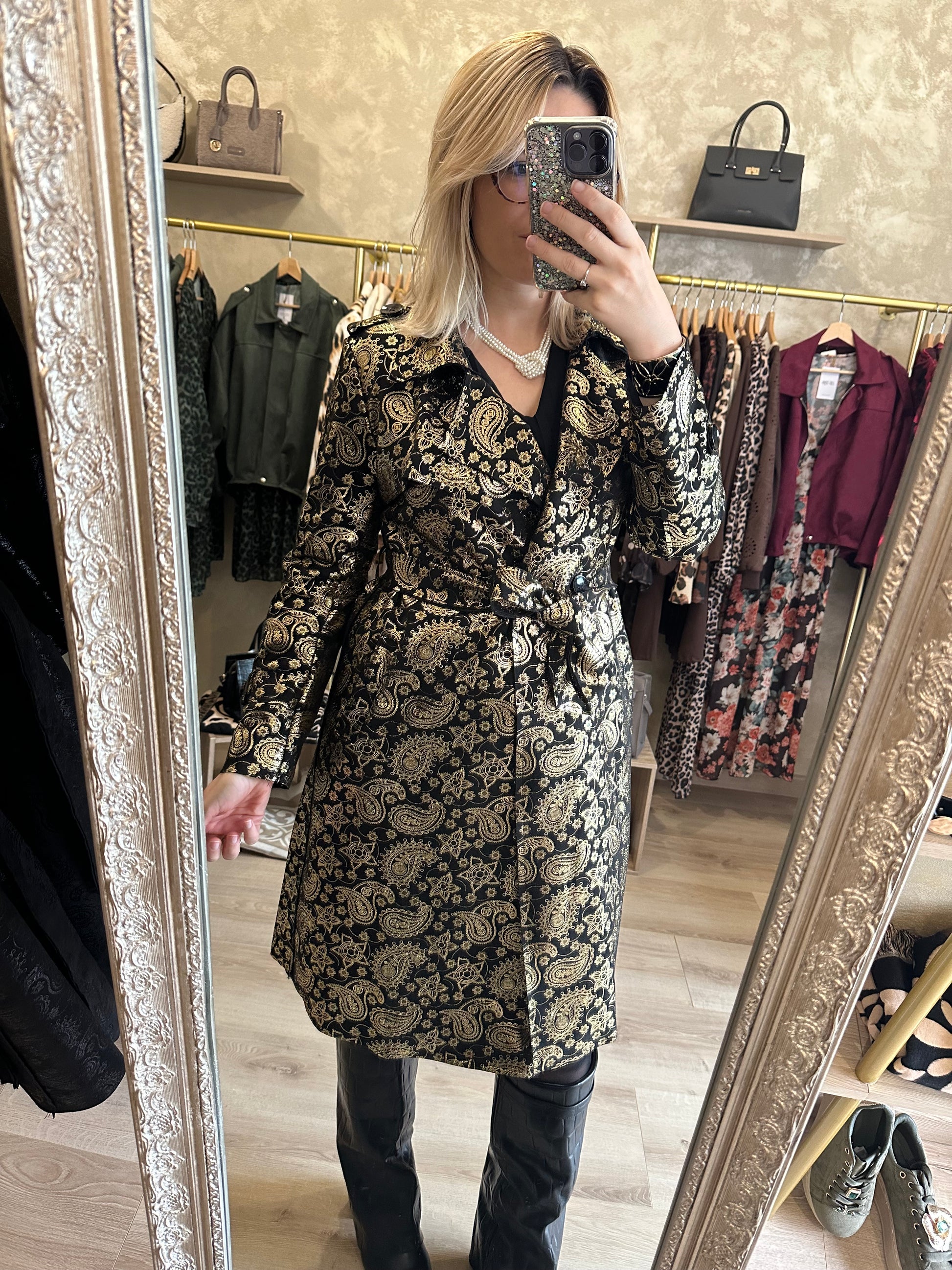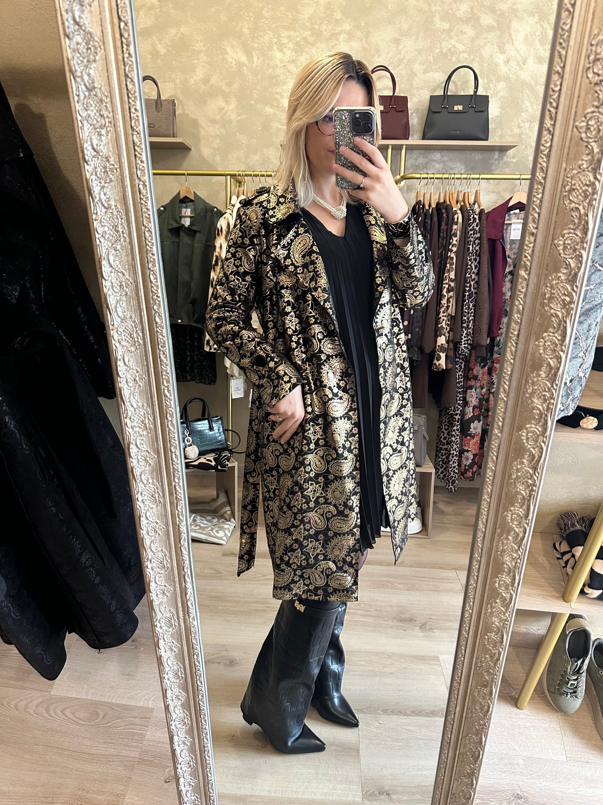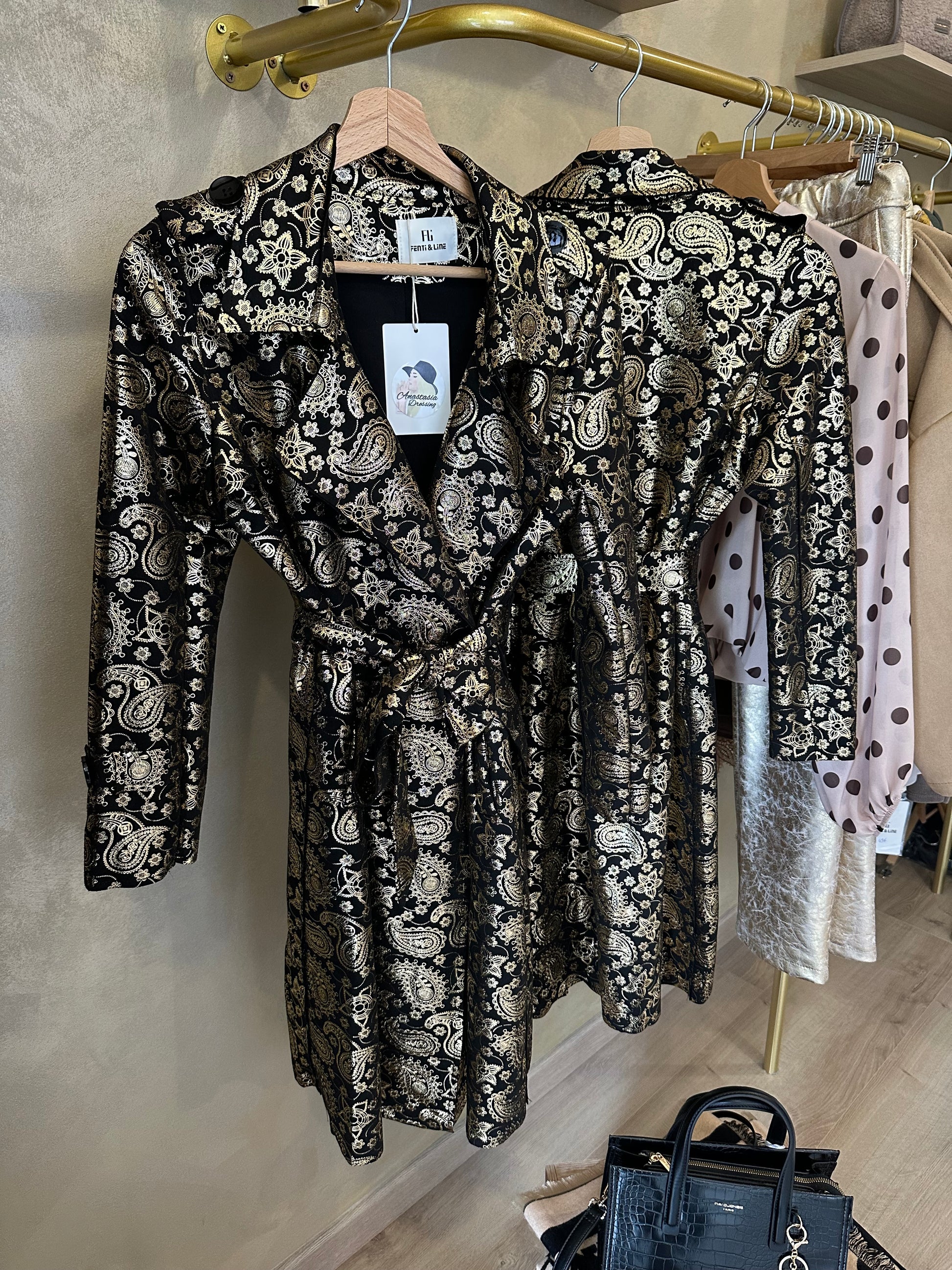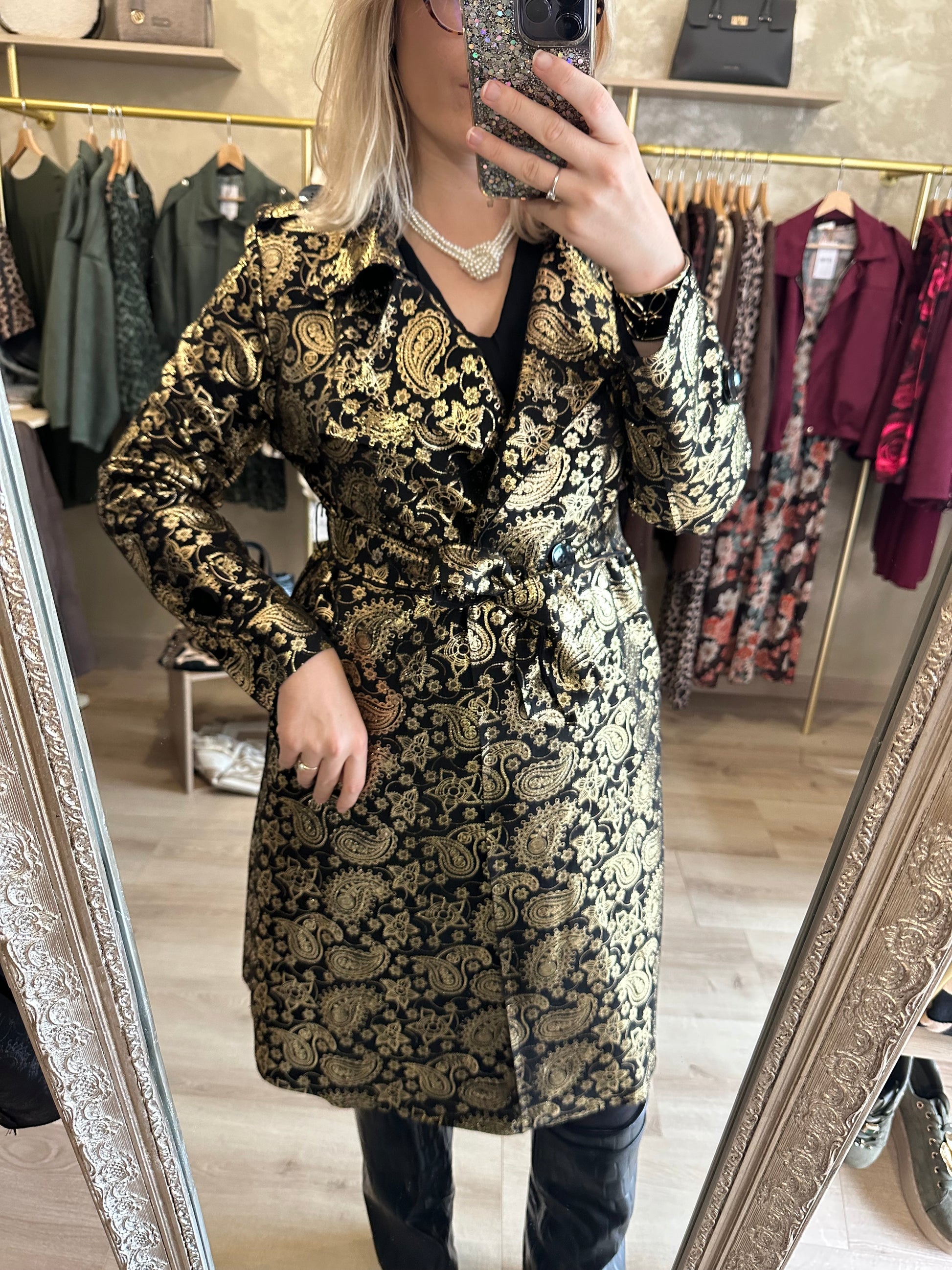 Trench long noir et doré chic et élégant