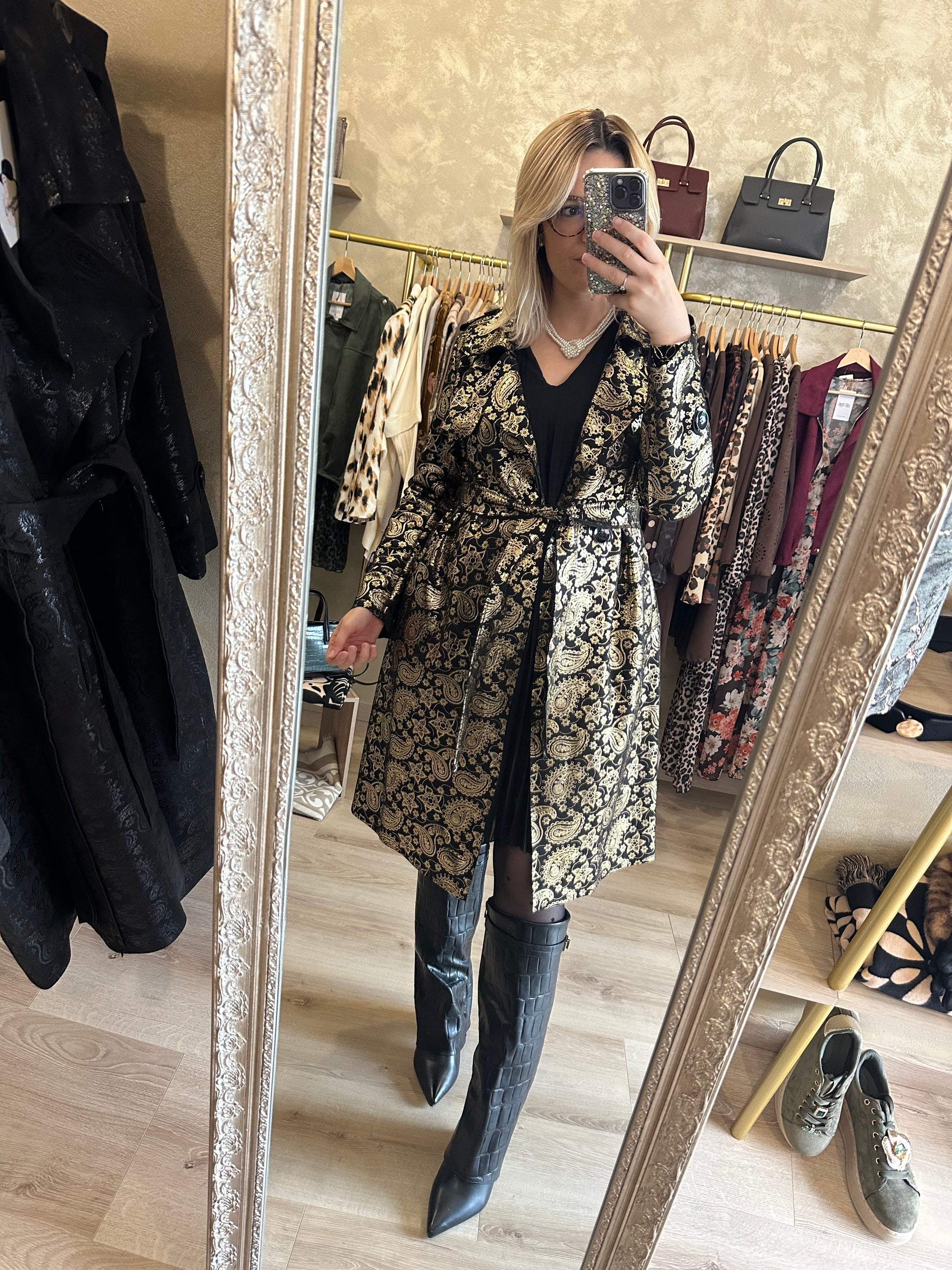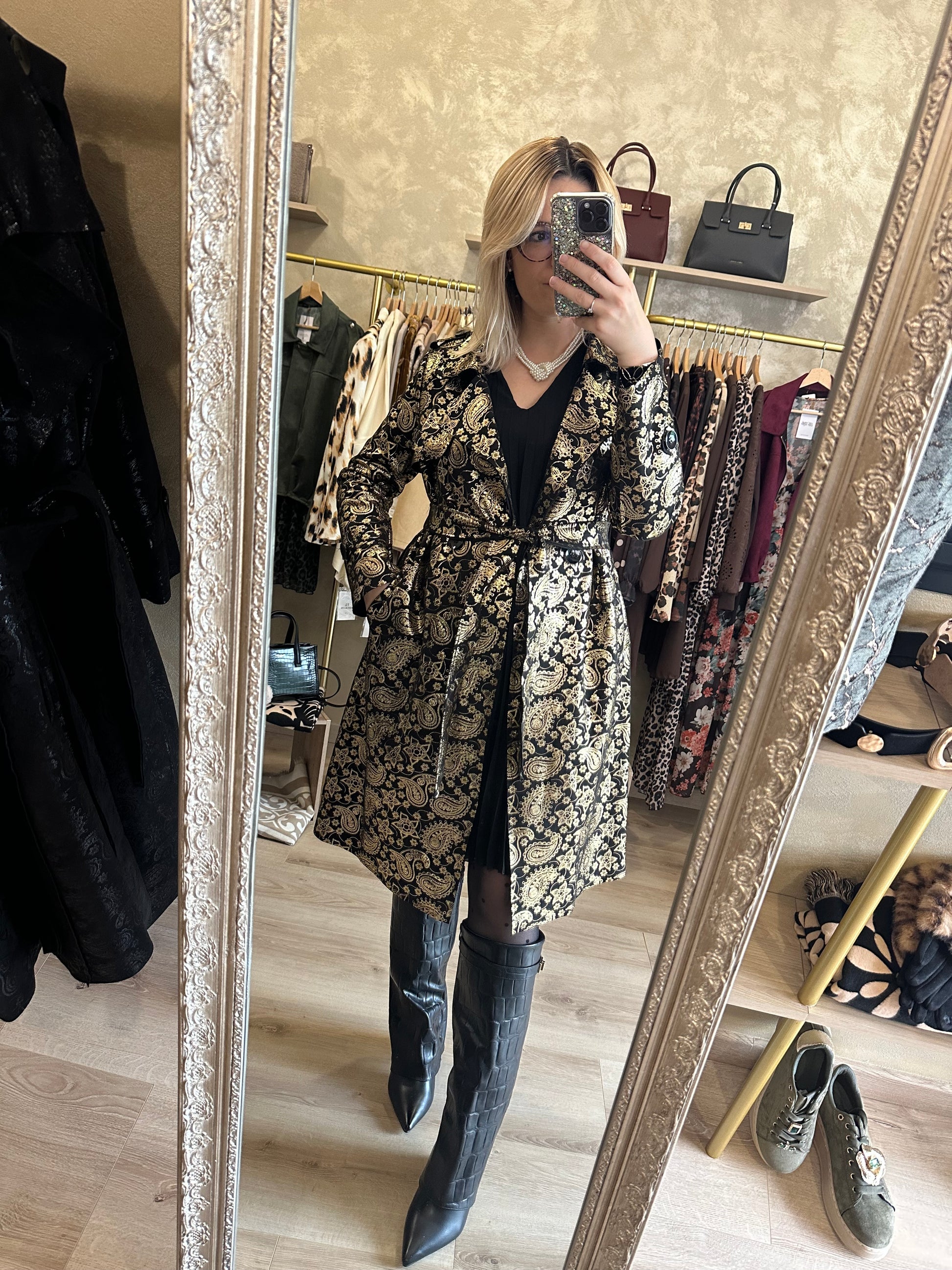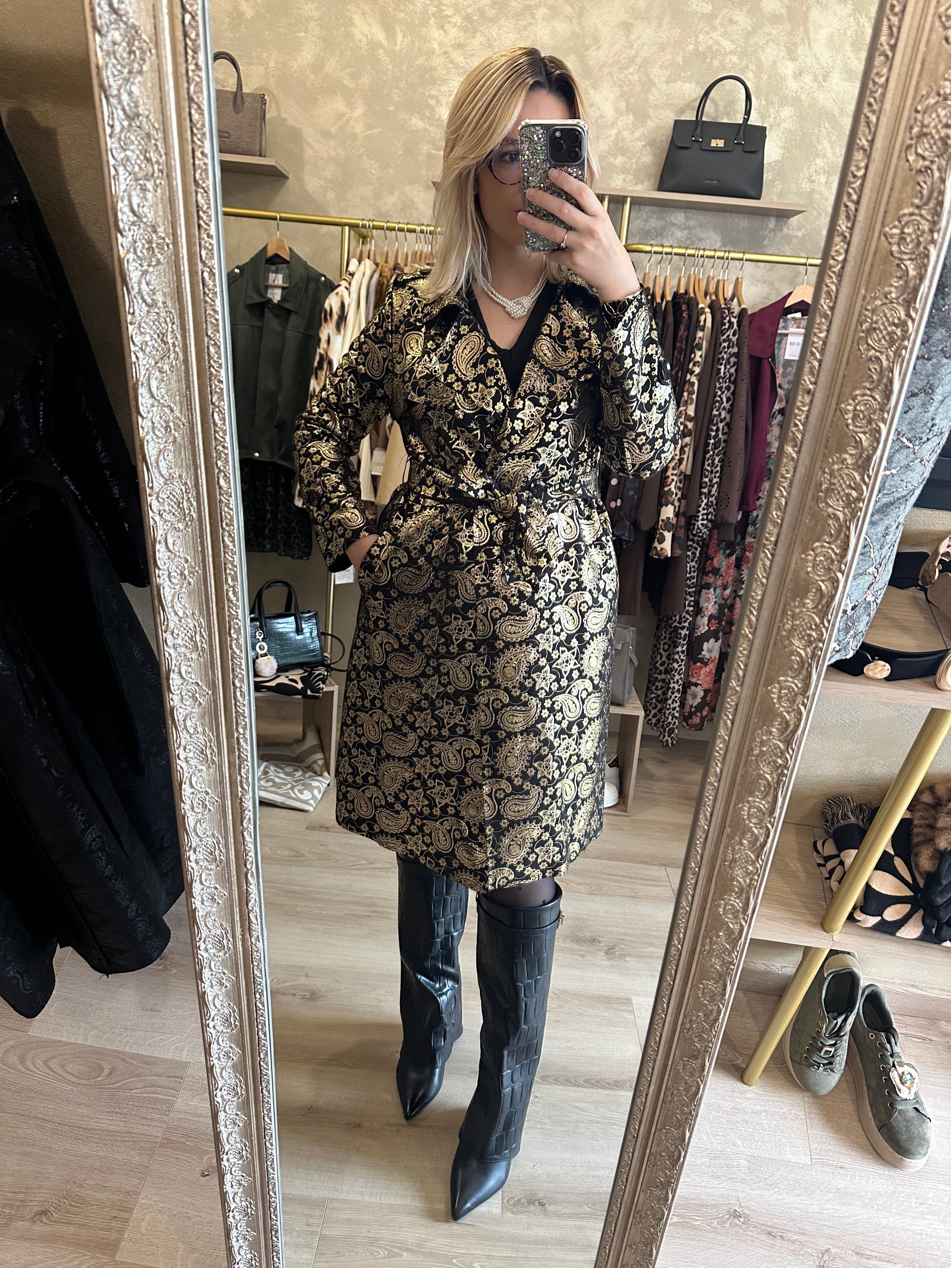 Trench long noir et doré chic et élégant
