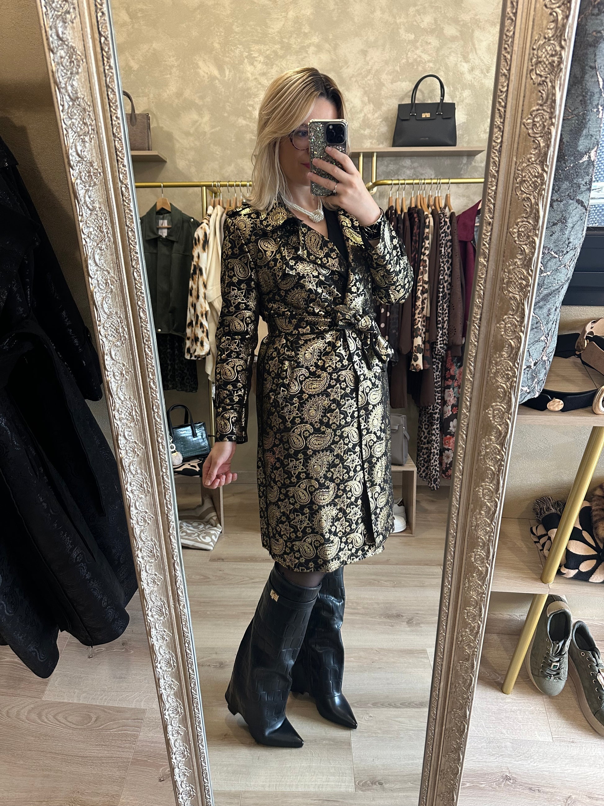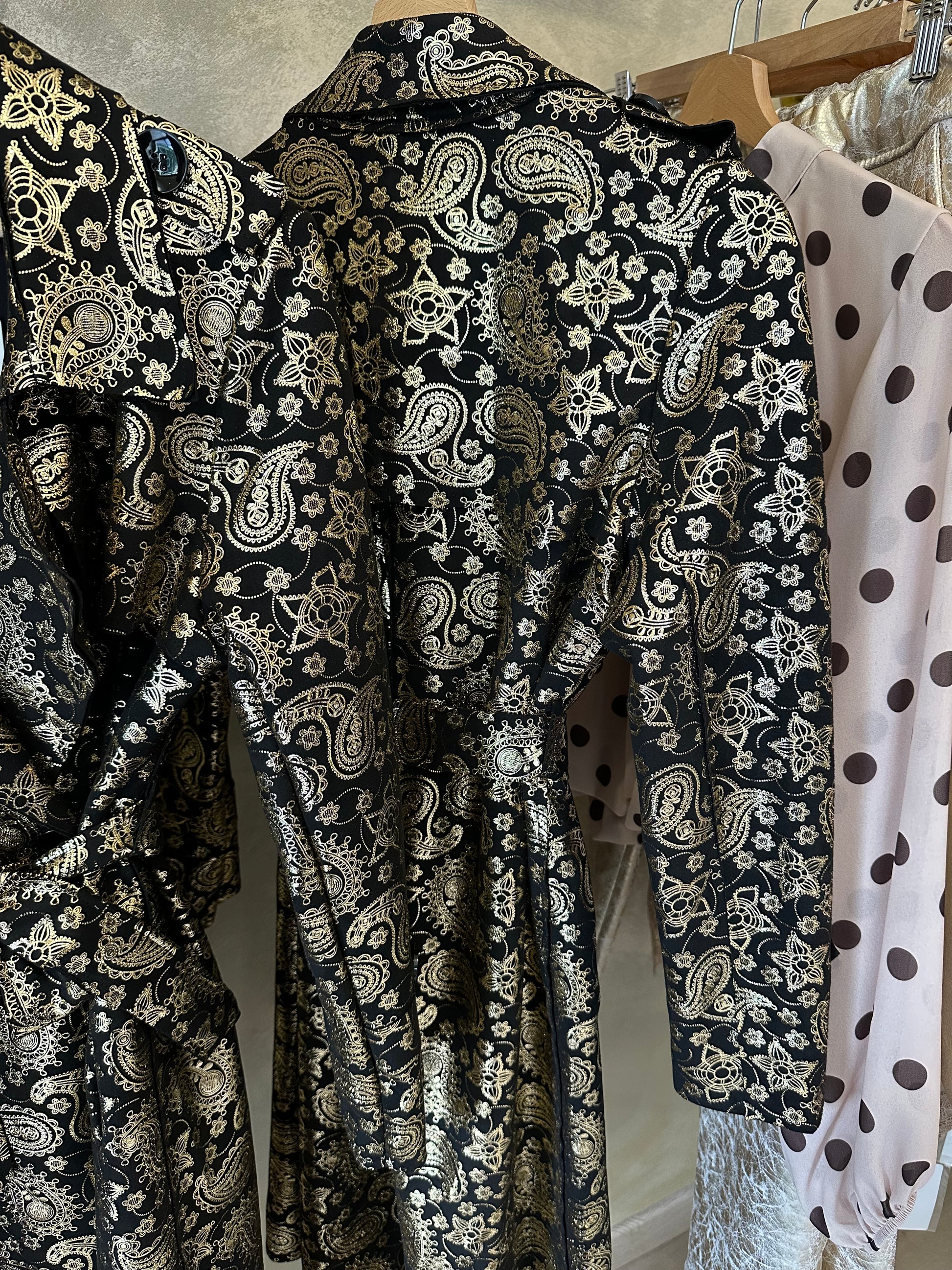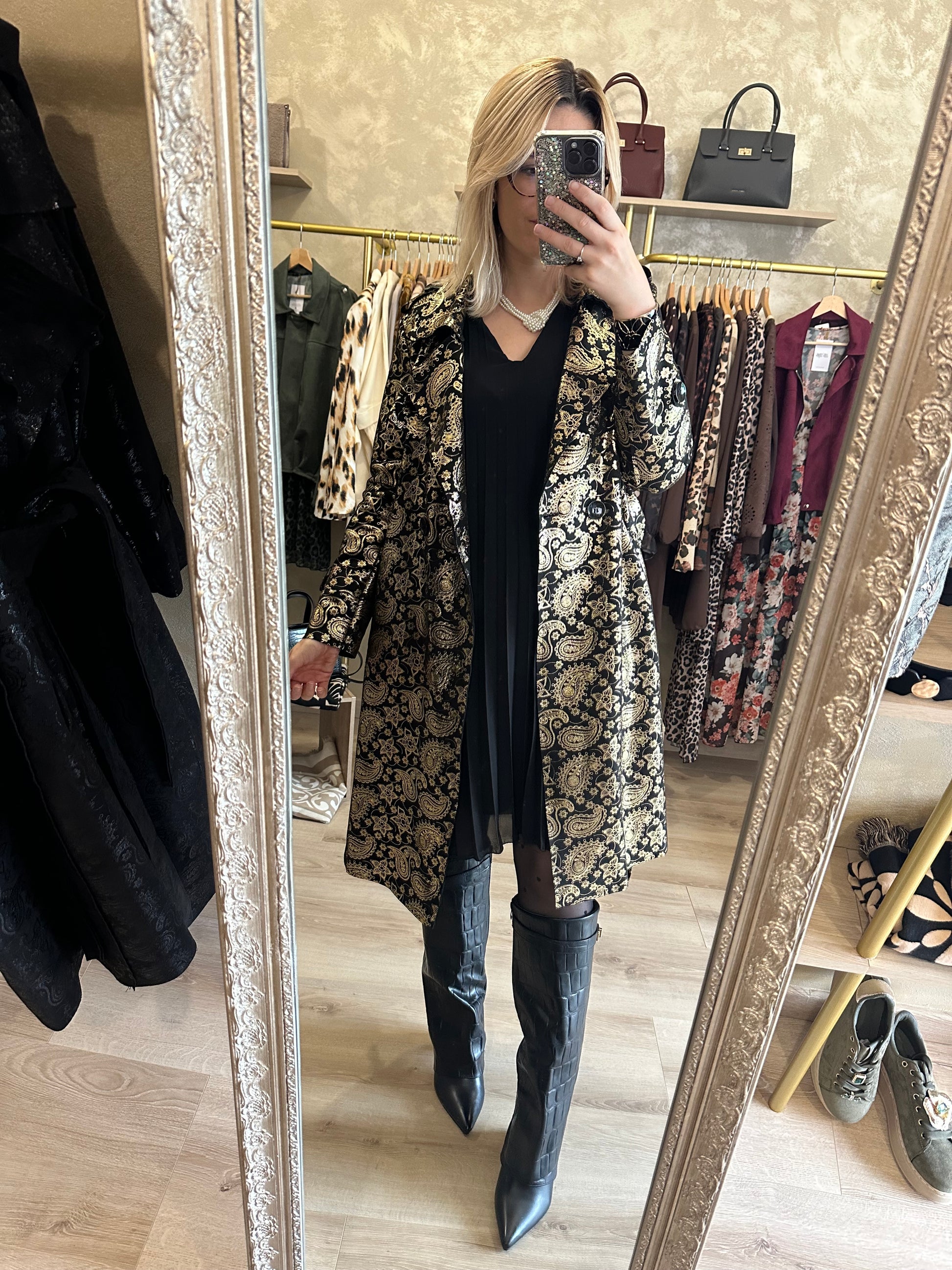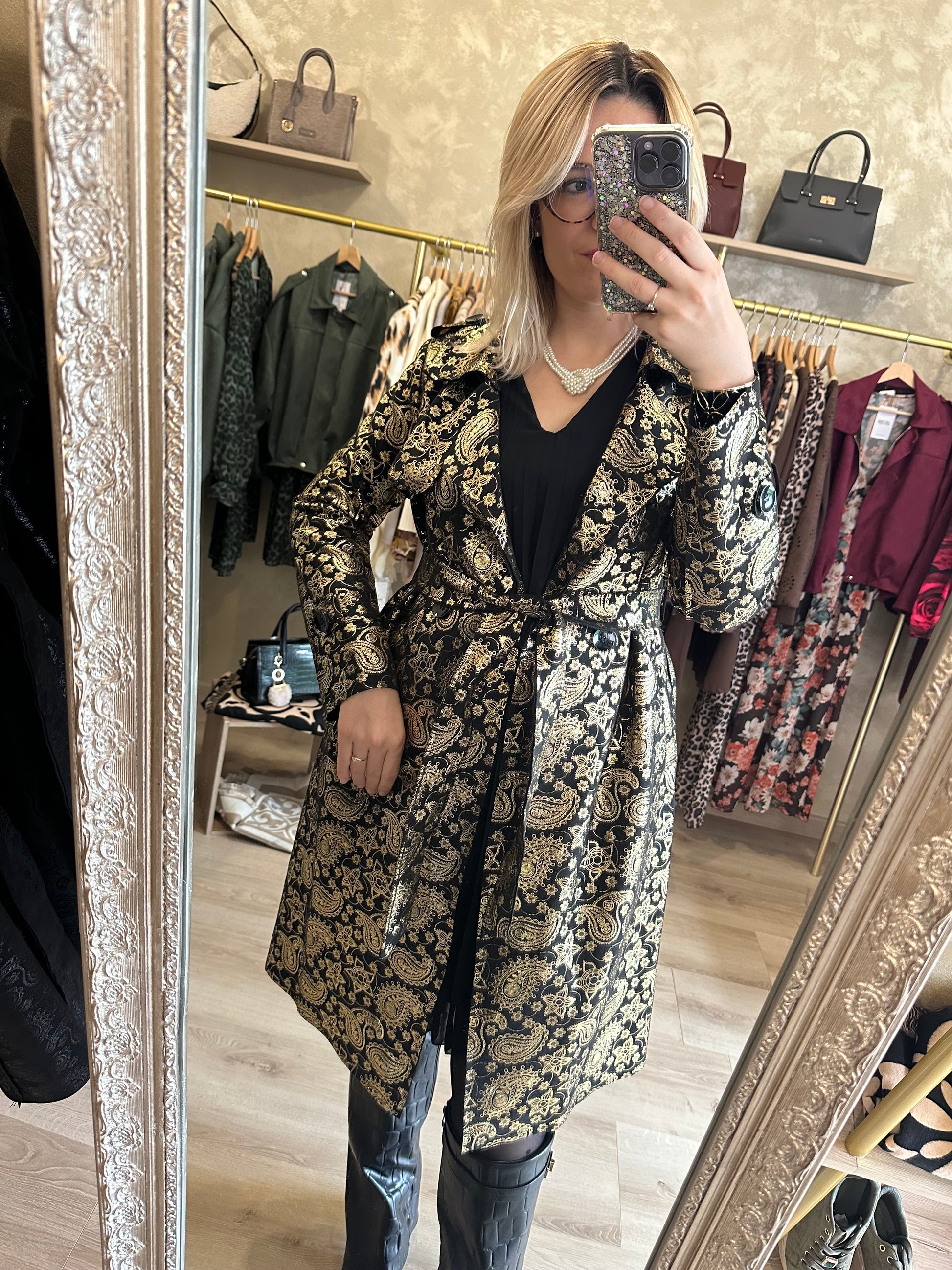 Trench long noir et doré chic et élégant